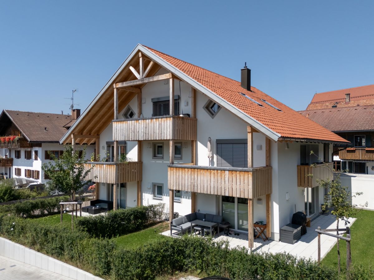 Mit dem Abbruch entstanden Raum und eine neue Offenheit nach Süden. Eine offen gestaltete Fassade mit überdachten Balkonen, großzügigen Verglasungen und vorgelagerten Terrassen mit Garten vermittelt zwischen Innen und Außen. Der Blick reicht über die Dächer hinweg in die Allgäuer Alpen bis nach Oberstdorf. Das Haus gewinnt dadurch an räumlicher Tiefe.