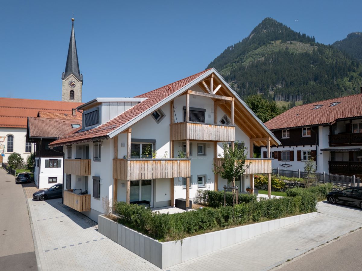 Mit dem Abbruch entstanden Raum und eine neue Offenheit nach Süden. Eine offen gestaltete Fassade mit überdachten Balkonen, großzügigen Verglasungen und vorgelagerten Terrassen mit Garten vermittelt zwischen Innen und Außen. Der Blick reicht über die Dächer hinweg in die Allgäuer Alpen bis nach Oberstdorf. Das Haus gewinnt dadurch an räumlicher Tiefe.